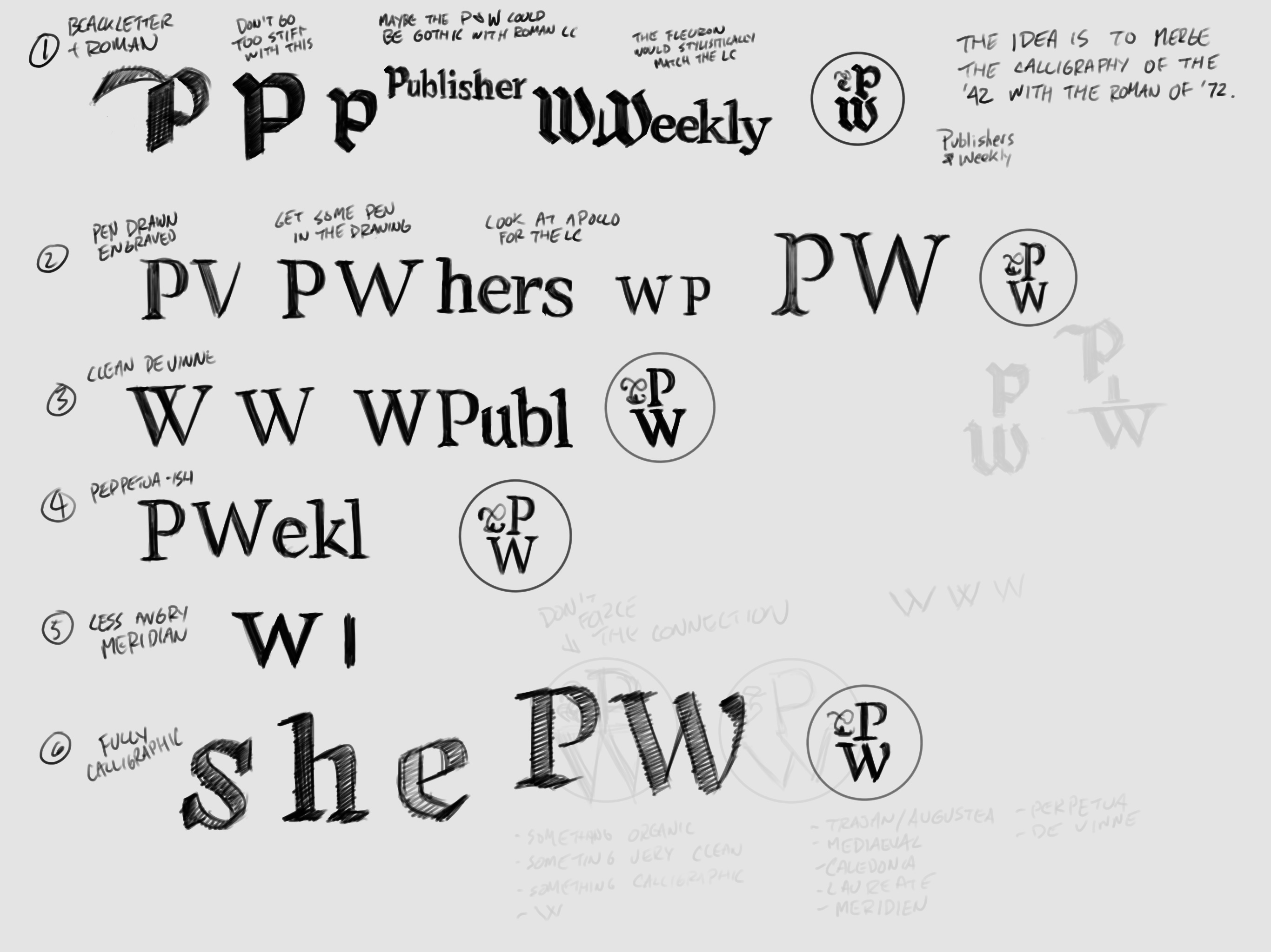 Publishers Weekly had been in publication for 152 years before Heather Haggerty and I got involved in redesigning it. During that time, the magazine had gone through numerous redesigns. Heather compiled a comprehensive collection of archival cover designs so that I could see the evolution of the logo in situ.